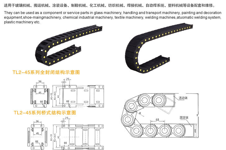 1.尼龍拖鏈外形似坦克鏈,由眾多單元鏈節組成,鏈節之間轉動自如。