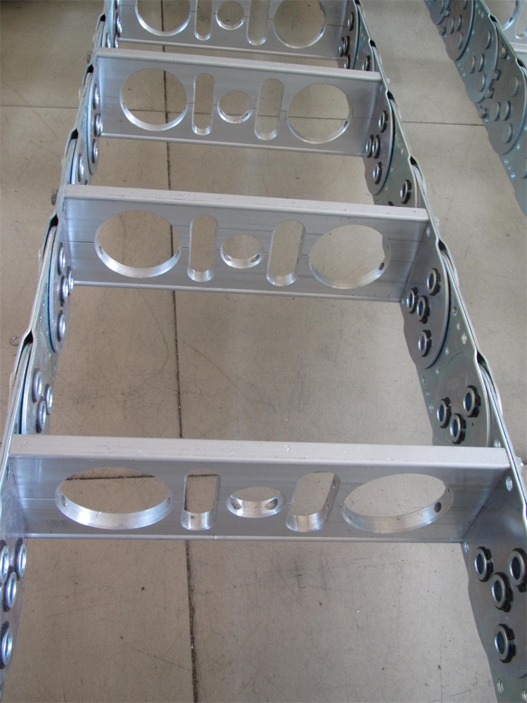 TL系列鋼鋁拖鏈主要由鏈板(鍍鉻的優質不銹鋼),支撐板(擠壓鋁合金)和銷軸(合金)等組成。