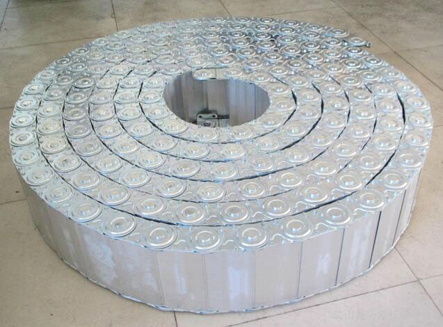 鋼鋁拖鏈的主體是由鏈板(采用優質鋼板經淬火后再拋光鍍鉻/鍍鋅/噴塑處理)、支撐板(擠拉鋁合金)、軸銷(合金鋼)等部件組成.使電纜或橡膠管與拖鏈之間不產生扭曲變形,鏈板經鍍鉻處理外形效果新穎,結構合理,靈巧強度高,該產品鋼性好,不變形.安裝方便,使用可靠,易拆裝,不下垂.由于本產品外形精美,可在較大程度上增強機床設備的整體藝術美觀效果,增強我國機床,機械設備在國際市場的競爭能力。