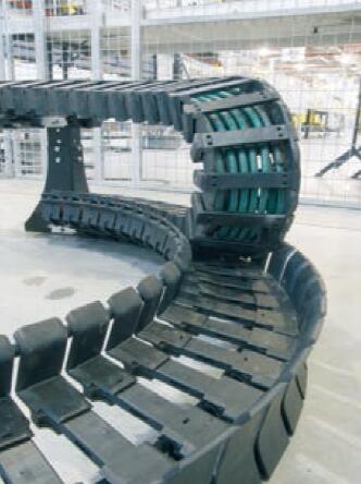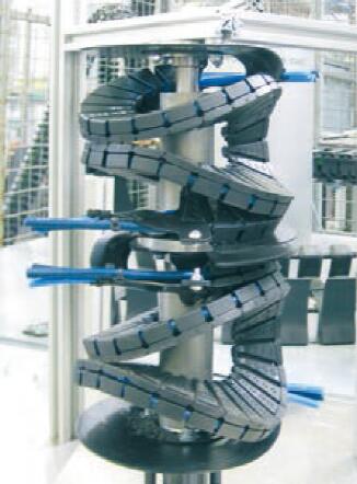 閔彬可提供做最大 540°的旋轉(zhuǎn)運(yùn)動的導(dǎo)向槽模塊化系統(tǒng)。這個系統(tǒng)分為內(nèi)圈和外圈。其中一圈與拖鏈連在一起,拖鏈與槽之間沒有相對運(yùn)動,所以摩損可降至最低。根據(jù)應(yīng)用環(huán)境,導(dǎo)向槽的材料為鍍鋅鋼或不銹鋼。