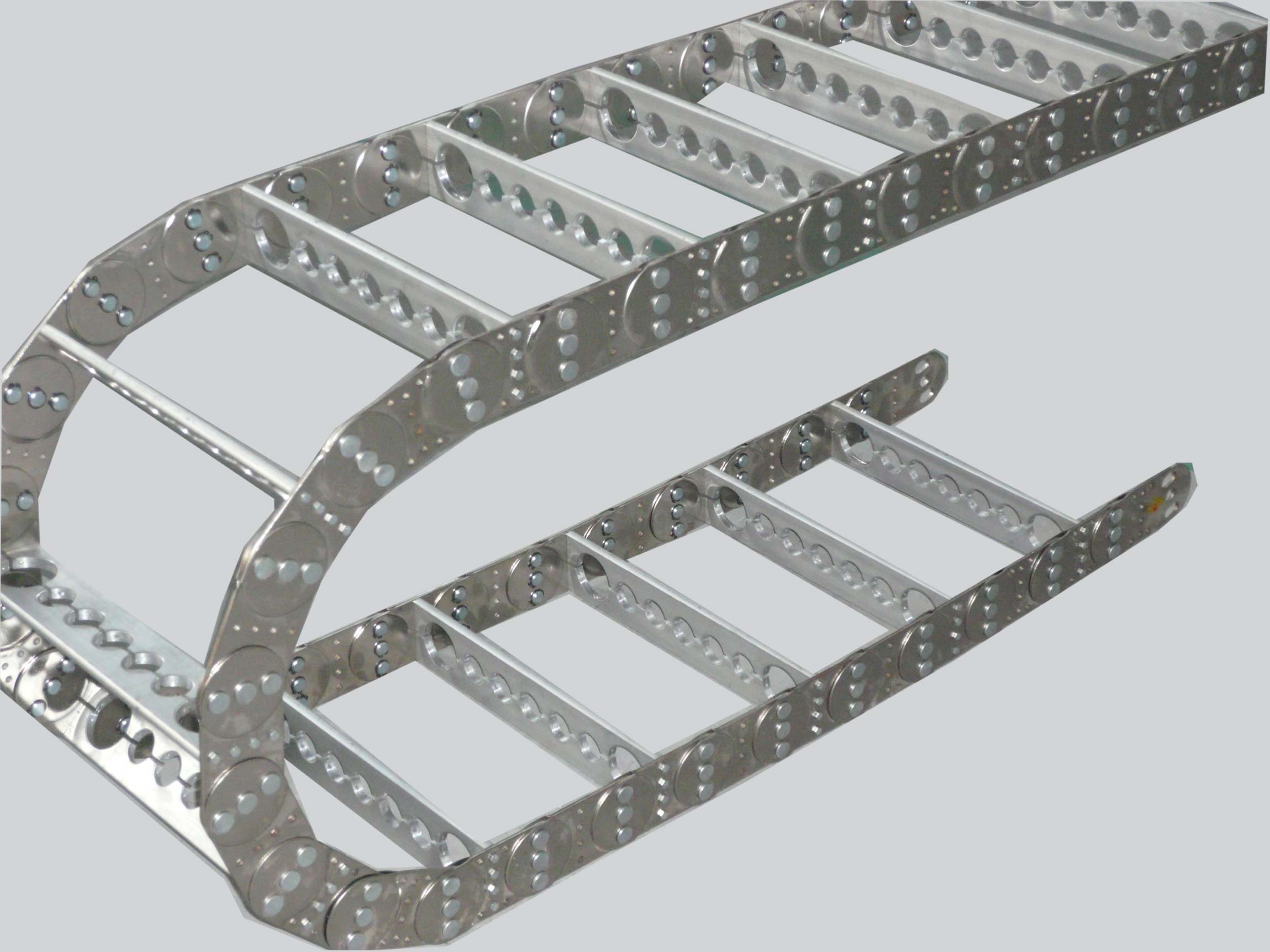 鋼鋁拖鏈分為TL系列鋼鋁拖鏈和TLG系列鋼鋁拖鏈,外形與坦克鏈相似,由眾多單元鏈節組成,鏈節之間轉動自如。相同系列的拖鏈內高、外高、節距相同,拖鏈內高、彎曲半徑R可有不同的選擇。單元鏈節由左右鏈板和上下蓋板組成,鋼鋁拖鏈每節都能打開,裝拆方便,不必穿線,打開蓋板后即可把電纜、油管、氣管等放入拖鏈內。另可提供分隔片,將拖鏈內空間按需要分隔開。